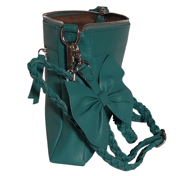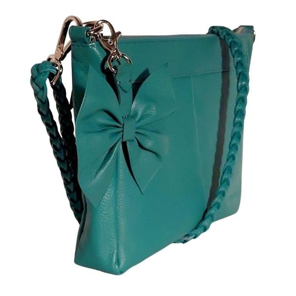 Pehmeänahkainen laukku, jossa irroitettava rusettikoriste tuo ripauksen leikkisyyttä.